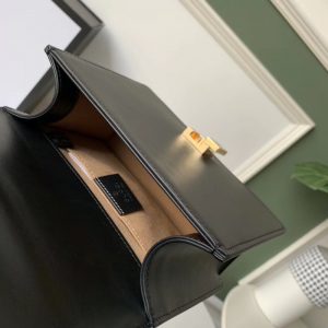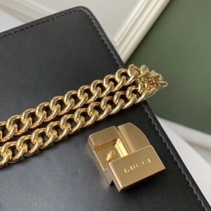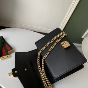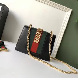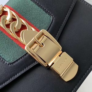 Đậm chất thanh lịch và sang trọng đặc trưng của dòng túi Gucci Sylvie. Là sự kết hợp túi đeo vai Sylvie kết hợp dây chuyền và khóa kim loại vàng với các chi tiết sọc tương phản, điểm nhấn đặc trưng của túi được trang trí bằng ruy băng vải kẻ sọc đỏ – xanh. Hình dạng đặc trưng của Gucci từ những năm 60 và 70 được mang trở lại từ các kho lưu trữ trong một sự lặp lại hiện đại. Hình dáng có cấu trúc đi kèm với hai dây đeo: một dây đeo vai bằng móc xích và một dây ruy băng vải grosgrain chuyển đổi từ tay cầm trên cùng sang vai.
