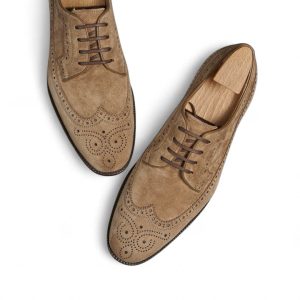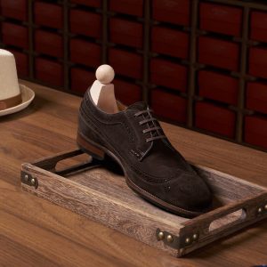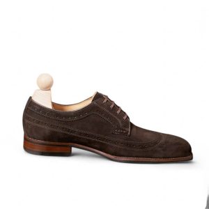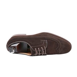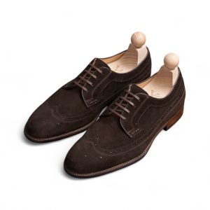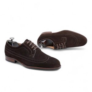 Giày Derby Longwing dễ dàng nhận diện bởi phần họa tiết “wing” (cánh) kéo dài từ mũi giày dọc theo thân giày đến tận gót, tạo nên một đường cong mềm mại và liền mạch. Các đường đục lỗ Brogue tinh xảo chạy dọc theo họa tiết này càng làm tăng thêm vẻ cổ điển và tỉ mỉ cho đôi giày.