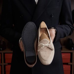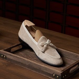 Giày loafer Belgian nổi tiếng với phom dáng ôm chân, mũi giày tròn và đường cắt (gọn gàng), mang đến vẻ ngoài thanh lịch và tinh tế. Điểm nhấn đặc biệt của phiên bản này nằm ở chi tiết tassel (tua rua) được trang trí ở phần mũi giày. Những chiếc tua rua mềm mại, uyển chuyển không chỉ tạo điểm nhấn thị giác mà còn thể hiện sự tỉ mỉ và gu thẩm mỹ tinh tế của người mang. Sự kết hợp giữa kiểu dáng Belgian cổ điển và chi tiết tassel duyên dáng tạo nên một tổng thể hài hòa, vừa trang trọng vừa mang chút phá cách.