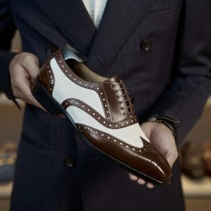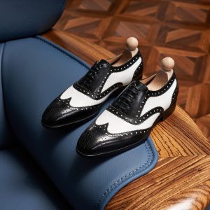 Kiểu dáng Oxford truyền thống với phần dây buộc kín (closed lacing) mang đến vẻ ngoài chỉn chu và trang trọng. Điểm đặc biệt nằm ở họa tiết Wingtip (mũi giày hình chữ W kéo dài về phía thân giày) được trang trí bằng các đường đục lỗ Brogue tinh xảo. Thiết kế này không chỉ tạo điểm nhấn thị giác mà còn gợi nhớ đến phong cách thời trang quý tộc Anh Quốc xưa. Giày Oxford Spectator Wingtip da bê là sự hòa quyện tinh tế giữa nét cổ điển lịch lãm và hơi thở hiện đại, phóng khoáng.