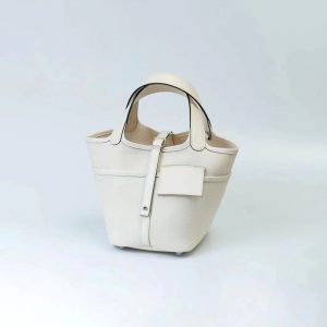 Hermès Picotin là một chiếc túi bucket cao cấp, hoàn toàn sang trọng với sự lôi cuốn tối giản. Túi tote được tạo thành từ dây buộc, với hai dây đai bằng phẳng và một khóa da được đóng chặt bằng khóa móc “H”. Picotin cũng có bốn chân đinh giúp bảo vệ đáy túi khỏi bất kỳ bề mặt nào bạn đặt nó lên.