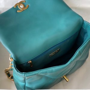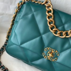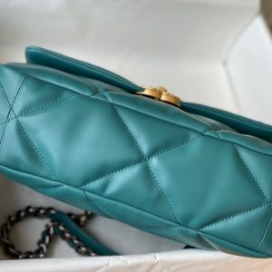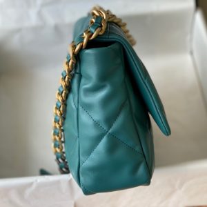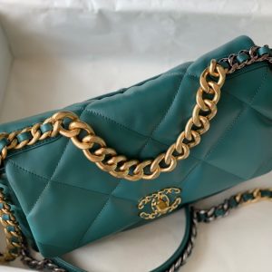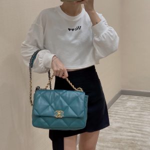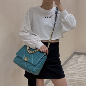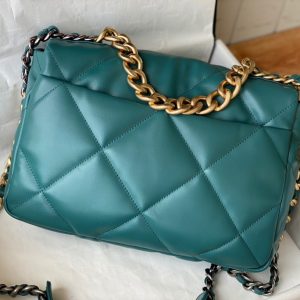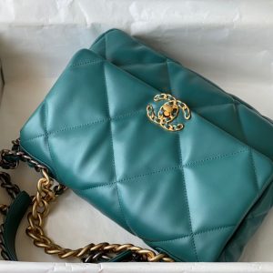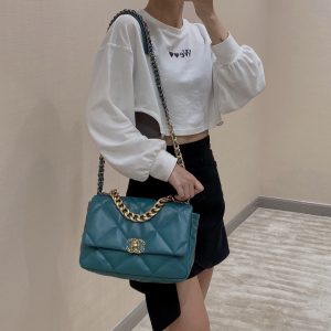 Chiếc túi 19 nắp phổ biến nhất màu xanh cao cấp, thiết kế retro khiến dân tình mê mẩn, túi được làm từ da cừu tinh tế tạo cảm giác siêu thoải mái và dây chuyền siêu cổ điển sang trọng. Túi thiết kế rộng rãi, có thể xách tay hoặc đeo chéo một bên vai, giản dị và thanh lịch. Và một trong những sự lựa chọn hoàn hảo nhất cho những chị em này chính là túi chanel 19 flap bag Lambskin nổi bật phong cách cuốn hút.