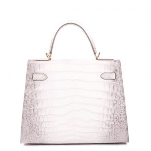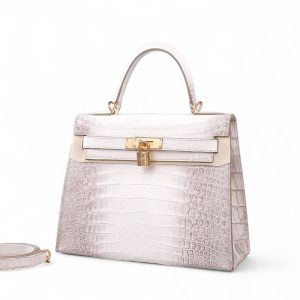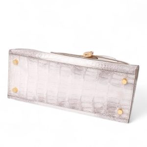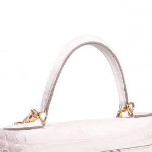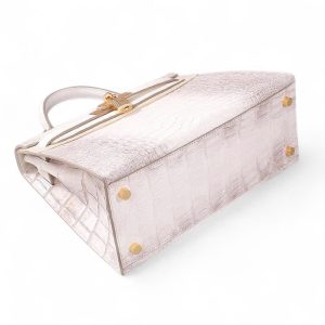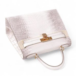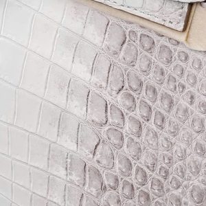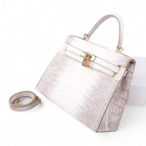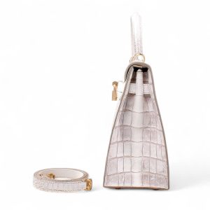 Túi xách nữ da cá sấu màu trắng Himalaya – TXTKLT0231S, là một mẫu cao cao của Olagood, túi được làm từ da cá sấu thuộc theo công nghệ với mô phỏng đỉnh núi tuyết Himalaya, đây là một kiểu thuộc da rất khó, đòi hỏi người thợ phải có tay nghề cao và rất tỉ mĩ cận thận. Cá được lựa chọn phải rất khắc khe, không một vết sẹo, vì thế giá thành của chúng tương đối cao hơn so với một số loại có màu sắc khác. Để làm được chiếc túi thế này người ta phải sử dụng tối thiểu phải từ 2 con cá sấu trở lên, cá được chọn vân phải đều ở hai bên và phải có kích cỡ đủ lớn.